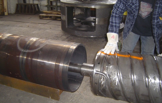 Das Fügen von rotationssymmetrischen Teilen, wie Walzenkörpern/-mänteln oder Laufrollen/-achsen hat in unserem Haus eine lange Tradition und beruht auf dem Prinzip des Einführens eines kalten Innenkörpers in einen im Ofen erwärmten und damit aufgeweiteten Außenkörper. Beim Abkühlprozess des äußeren Bauteils, zieht sich dieses zusammen und schrumpft auf den kalten Innenkörper auf. Mit dem Temperaturausgleich der beiden Teile entsteht eine unlösbare Verbindung. Da dies innerhalb weniger Minuten oder gar Sekunden eintreten kann, kommt es hier ganz besonders auf das richtige Know-How an. Wir fügen sowohl senkrecht als auch - bei längeren Teilen - waagerecht. Je nach Bauteilgeometrie und Spannungszustand ist ein anschliessendes Spannungsarmglühen / Entspannen empfehlenswert. Durch die gemeinsame Erwärmung der gefügten Teile, können etwaige, beim Aufschrumpfen des Außenkörpers entstandene, Spannungen beseitigt und damit verbesserte Rundlaufeigenschaften hergestellt werden.